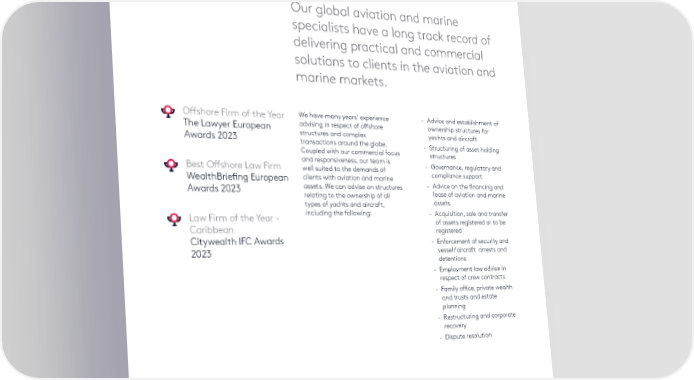 Superyacht and luxury asset services in the UAE Legal services for Aviation and Marine Our global aviation and marine specialists have a long track record of delivering practical and commercial solutions to clients in the aviation and marine markets. O昀昀shore Firm of the Year We have many years' experience - Advice and establishment of The Lawyer European advising in respect of o昀昀shore ownership structures for Awards 2023 structures and complex yachts and aircraft transactions around the globe. - Structuring of asset holding Coupled with our commercial focus structures Best O昀昀shore Law Firm and responsiveness, our team is - Governance, regulatory and well suited to the demands of compliance support WealthBrie昀椀ng European clients with aviation and marine - Advice on the 昀椀nancing and Awards 2023 assets. We can advise on structures lease of aviation and marine relating to the ownership of all assets types of yachts and aircraft, Law Firm of the Year - including the following: - Acquisition, sale and transfer Caribbean of assets registered or to be registered Citywealth IFC Awards - Enforcement of security and 2023 vessel / aircraft arrests and detentions - Employment law advice in respect of crew contracts - Family o昀케ce, private wealth and trusts and estate planning - Restructuring and corporate recovery - Dispute resolution 6